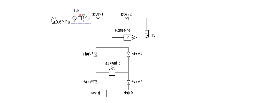 1、先打开V1、V3、V4阀进行加压行程,对工件进行充气,设定充气时间需保证工件内压力饱和,充气时间结束,进气阀关闭,进入平衡1保压检大漏;