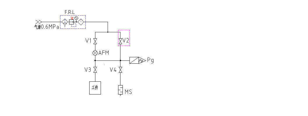 启动气密检漏仪进行检测后,设备首先进入充气状态,没有内部旁路加压阀的机型V1、V3阀将打开,V4阀关闭,设备将从气源端向被测产品充入规定压力的压缩空气;具有内部旁路加压阀的机型,设备进入充气状态时V2、V3阀打开,V1、V4阀关闭,设备将通过旁路加压阀从气源端向被测产品充入规定压力的压缩空气。待产品充气时间到,检漏仪进入平衡状态,此时V1、V3阀打开,V2、V4阀关闭,单位时间内流过流量传感器AFM上的气体流量将逐渐稳定。接下来气密检漏仪进入检测阶段,给出相应的泄漏流量值及检测合格与否信号。